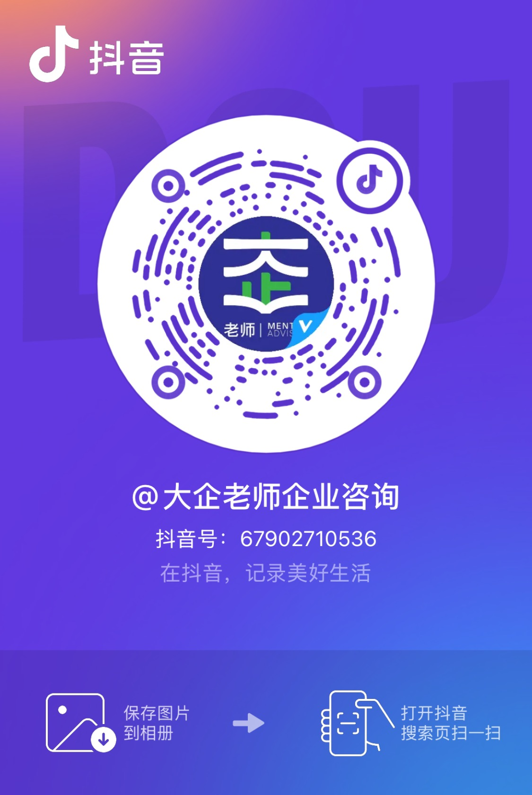 在搜索欄輸入“大企老師企業(yè)咨詢”或輸入抖音號(hào)“67902710536”