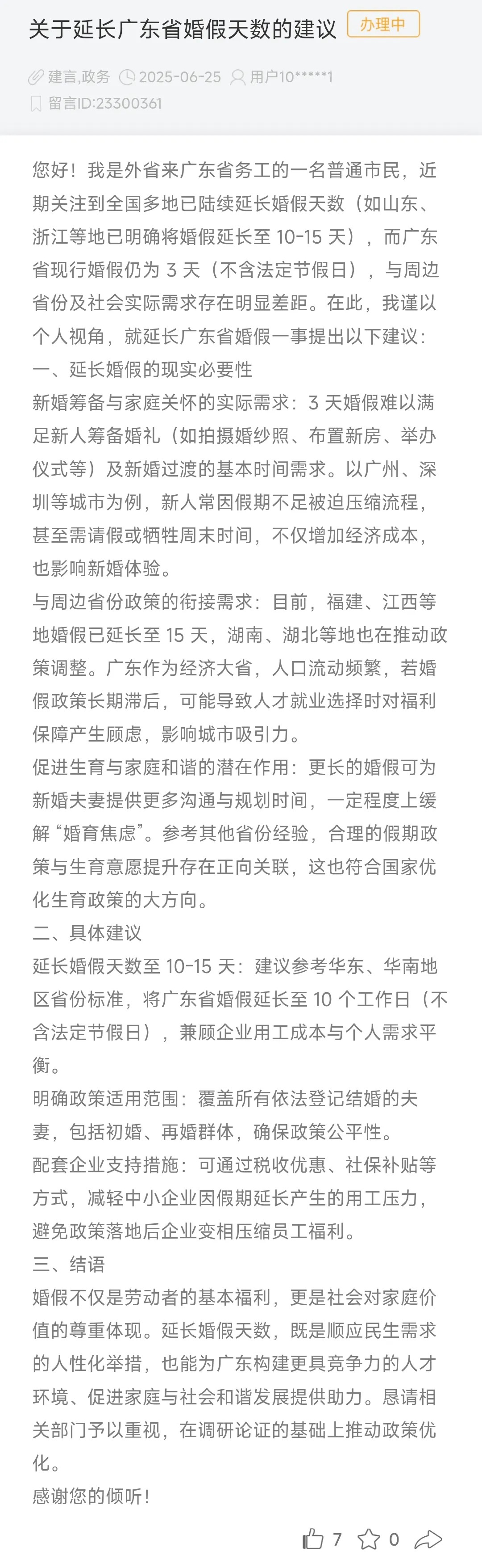 近日,有網(wǎng)友在人民網(wǎng)領(lǐng)導(dǎo)留言板上發(fā)帖建議廣東延長婚假至10-15天,并給出理由:3天婚假無法滿足新人籌備婚禮及過渡需求;更長婚假可緩解“婚育焦慮”,與生育意愿提升正相關(guān),符合國家政策方向;同時可配套稅收優(yōu)惠、社保補貼等減輕中小企業(yè)用工壓力。