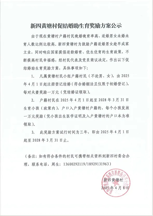 ● 今年5月,廣東省東莞市橫瀝鎮(zhèn)新四黃塘村公布婚育獎勵方案,符合婚姻法且僅限于初婚登記,可獲一萬元獎勵。
