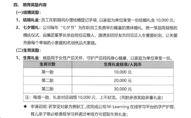 ● 2024年3月,廣東企業(yè)名創(chuàng)優(yōu)品發(fā)布《婚育獎勵方案》員工在職期間辦理結(jié)婚登記可獲1萬元禮金獎勵。