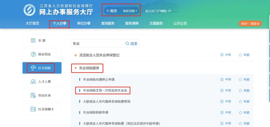 二、登錄江蘇省人力資源和社會保障廳網(wǎng)上辦事服務(wù)大廳(https://rs.jshrss.jiangsu.gov.cn/index/),完成登錄后,在“個(gè)人辦事—社會保險(xiǎn)—失業(yè)保險(xiǎn)服務(wù)—失業(yè)保險(xiǎn)生育一次性加發(fā)失業(yè)金”模塊,提交辦件材料后提交申請。
