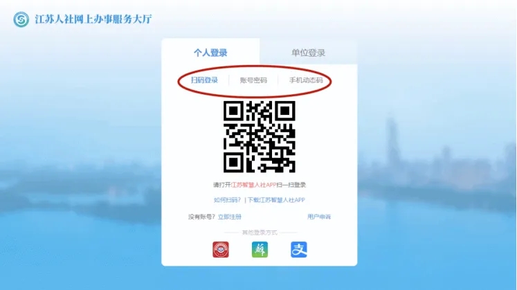 1、登錄“江蘇人社網(wǎng)辦大廳”網(wǎng)站(https://rs.jshrss.jiangsu.gov.cn/index/),點(diǎn)擊右上角“請(qǐng)登錄”,選擇“個(gè)人登錄”,在三種登錄方式中選擇一種:(1)使用“江蘇智慧人社”APP掃一掃登錄;(2)賬號(hào)密碼登錄;(3)手機(jī)動(dòng)態(tài)碼登錄。