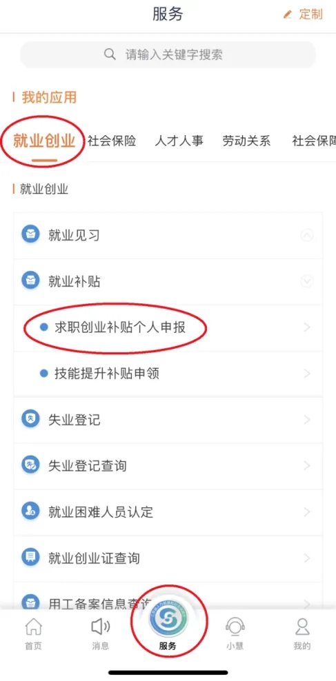 注冊(cè)并登錄“江蘇智慧人社”APP,選擇“服務(wù)”—“就業(yè)創(chuàng)業(yè)”—“就業(yè)補(bǔ)貼”—“求職創(chuàng)業(yè)補(bǔ)貼個(gè)人申報(bào)”。