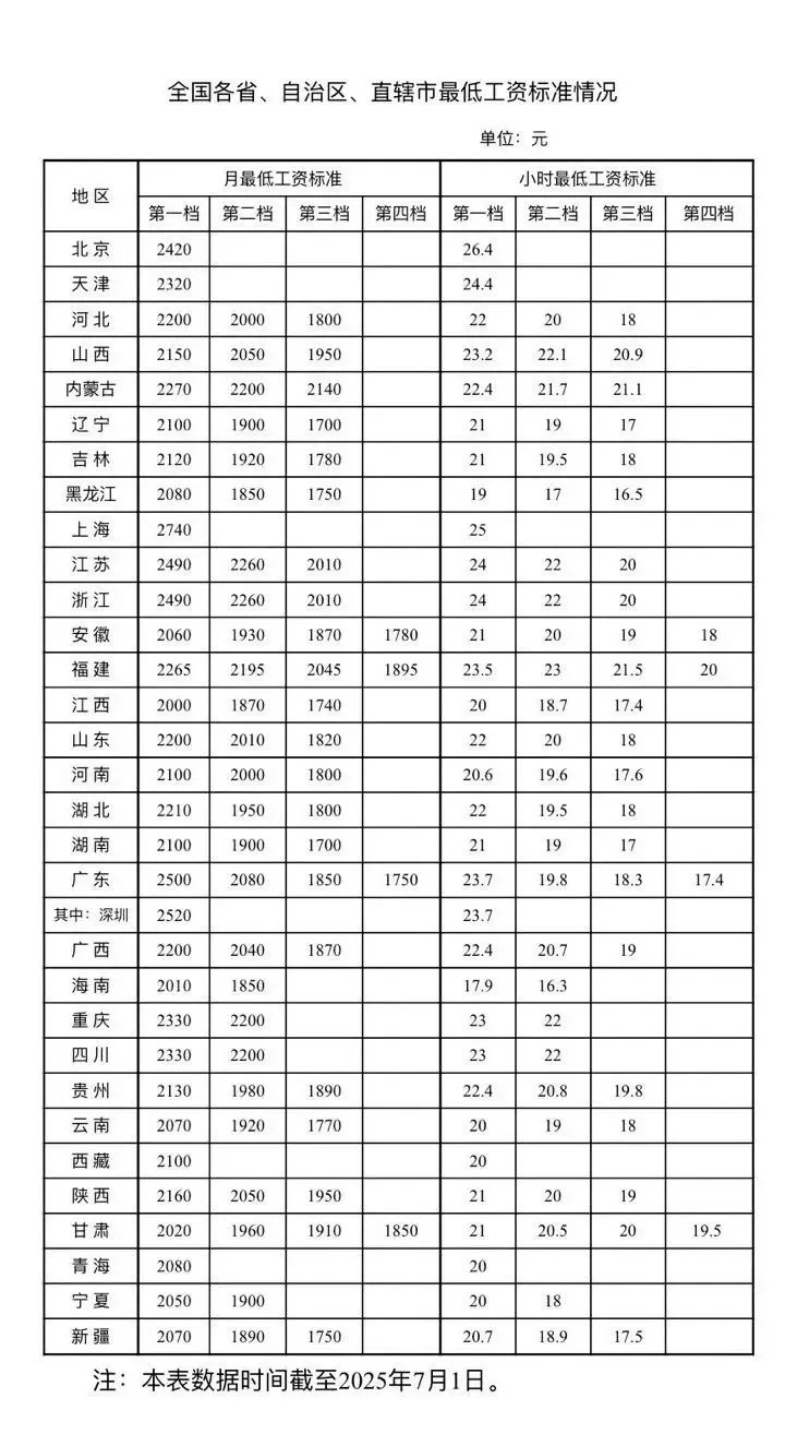 日前,人社部官網(wǎng)公布全國(guó)各省、自治區(qū)、直轄市最低工資標(biāo)準(zhǔn)情況,截至2025年7月1日。